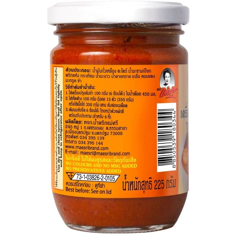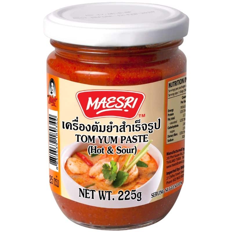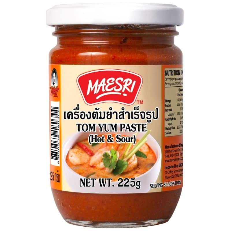 Maesri’s Tom Yum Paste (Hot & Sour) – the key to effortlessly creating the renowned Tom Yum soup at home. Tailored for home cooks, our expertly crafted recipe blends chilies, lemongrass, shallots, and essential herbs to capture the authentic Tom Yum flavour. Experience a refreshing and juicy soup with a perfect balance of hot and sour notes, delivering the bold and vibrant taste of Thailand to your kitchen. Prepare by boiling water or heating stock, add sliced mushrooms, chopped lemongrass, coriander, and your preferred protein. Introduce Maesri’s Tom Yum Paste, mix, and savour the convenience and exceptional taste, customisable with fresh lime and fish sauce.